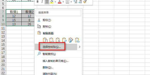 3:然后用鼠标右键单击选中的单元格,在弹出的对话框中点击选择性粘贴。