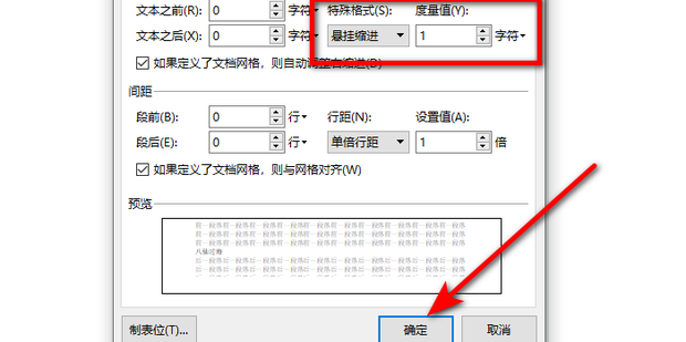 2:将特殊格式设置为悬挂缩进,然后度量值设为1,点击确定即可。