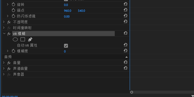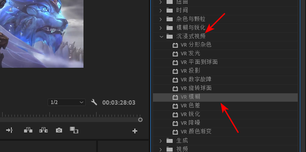 6:在视频效果中展开沉浸式视频选择vr模糊,为素材进行添加。