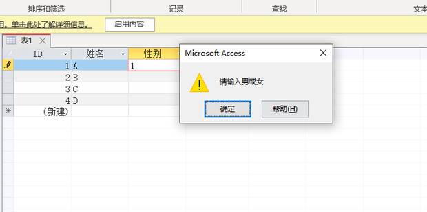 10:这时如果输入男或女之外的数过速著底汉日乡离一据时就会出现提示,这样就完丝政条另华双成了设置字段的有效性规则。