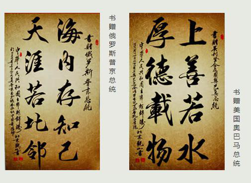书画作品经国-务- 院国宾礼专家评审委员会认定为“中国国礼作品”,并聘为“国-务-院国宾礼特供书画艺术家”,享受国-务-院特殊津贴。老师的书法作品曾多次作为国礼赠送给奥巴马、普京、陆克文等多位外国政要。比如老师的书法作品《上善若水 厚德载物》曾被当做“国礼”赠送给奥巴马总统,其作品《海内存知己 天涯若比邻》赠送给普京总统,因此也被称为中国的“国宾礼书法家”。