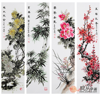除了上面介绍的“富贵牡丹画”外,还有“招财旺运九鱼图”(可登陆,推荐选购张洪山、王建辉、萧红的九鱼图)、多子多福葡萄图(推荐选购签约画家羽墨老师的葡萄作品)、梅兰竹菊四条屏、喜庆吉祥柿子图、圣洁品格荷花图、步步高升竹子图(石荣禄墨竹、红竹画系列)等。