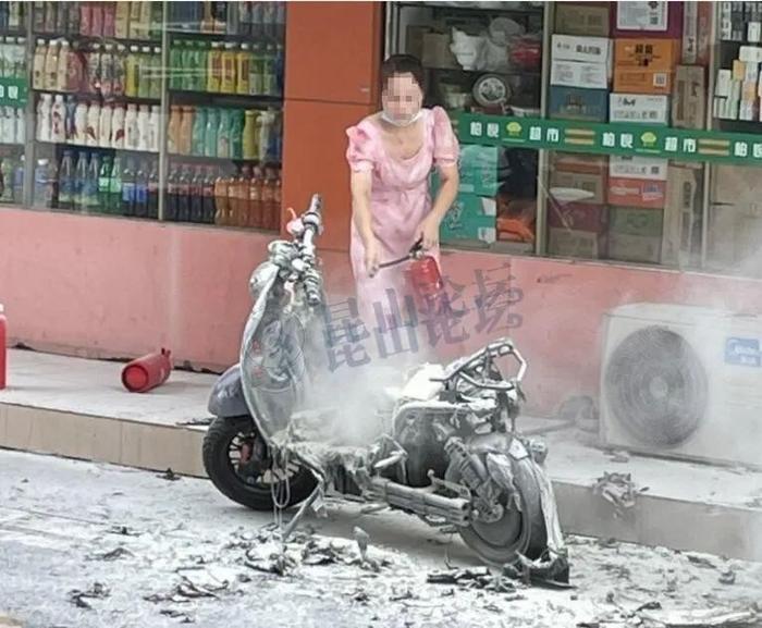 昆山论坛网友“离魂异客”发帖:这天实在太热了,昆山前进路维也纳酒店门口电瓶车自燃,万幸没有波及到什么。