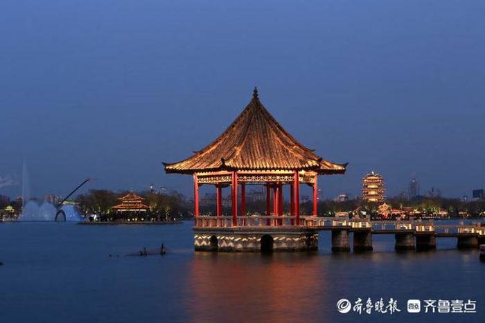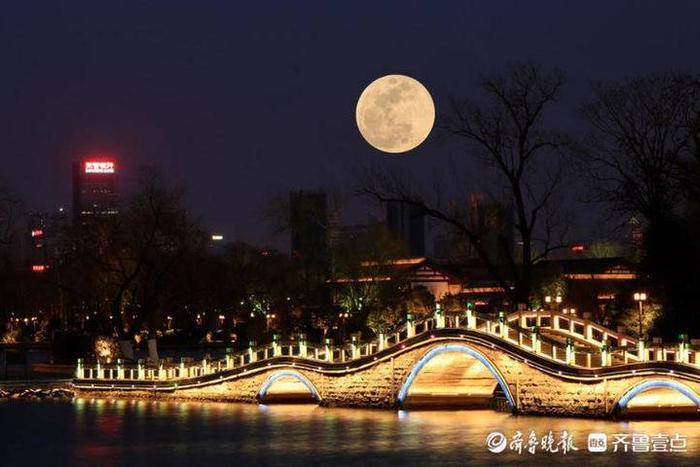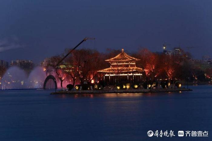 1月22日,壹粉“泉水叮咚126”向齐鲁晚报官方客户端齐鲁壹点情报站发来一组济南大明湖夜景的照片,华灯初上,大明湖简直披上了秀场的灯光,皎洁的明月悬挂在彩桥之上,五颜六色的彩灯像颗颗明珠点缀在湖边。