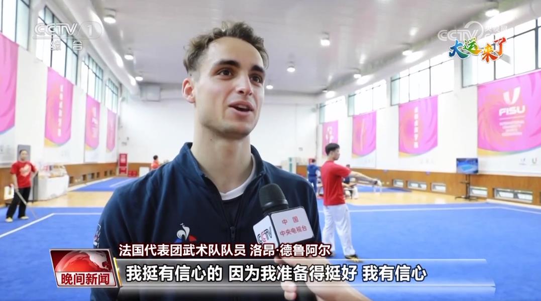 法国代表团武术队队员 洛昂·德鲁阿尔:我要比赛的项目是长拳和棍术。我每天都会训练,一天一般训练两次。我挺有信心的,因为我准备得挺好,我有信心。