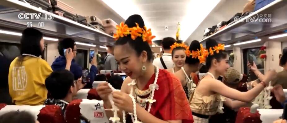 总台记者 杨探骊:我现在是在中老铁路国际旅客列车的跨境车厢。大家可以看到老挝的当地演员现在来到了车厢里,给这些跨境的乘客送上花环,并祝他们旅途愉快。