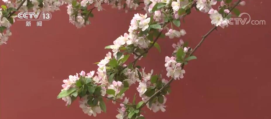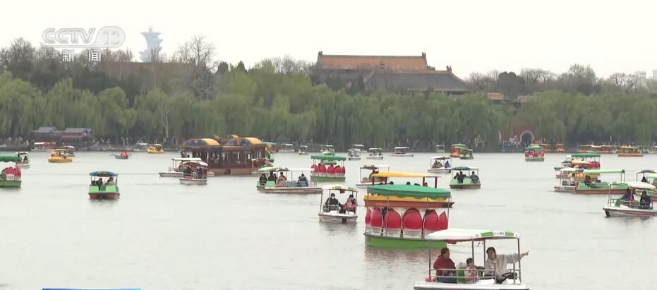 在北海公园,成片的海棠迎风盛放。人们在湖上泛舟,边赏花边拍照,享受春日。