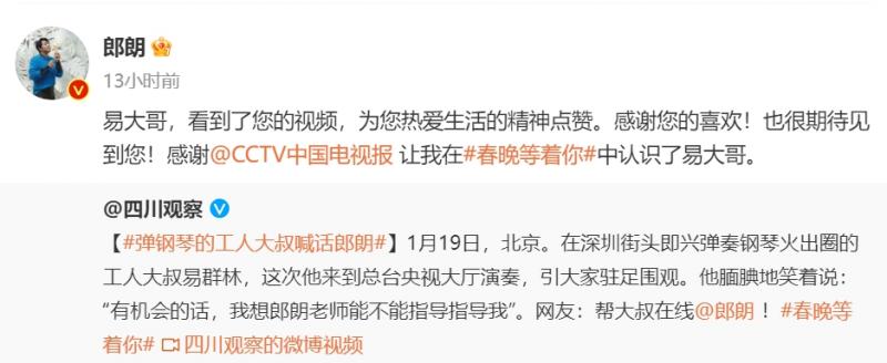 58岁建筑工人易群林,曾在深圳街头用公益钢琴弹奏多首曲子,引来路人阵阵掌声。钢琴是他年少时在亲戚家学的,几十年过去依然记得。近日,易大哥受邀现场观看总台春晚,还在北京弹起钢琴。他说,自己的愿望之一是能请郎朗指导自己。 20日,郎朗回应说,期待与易群林相见,“易大哥,看到了您的视频,为您热爱生活的精神点赞。感谢您的喜欢!也很期待见到您!“ 文/于建