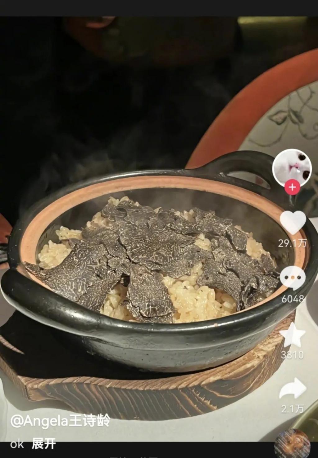 市面上优质的黑松露要达到上万块一斤,在高级餐厅里卖得就更贵,基本上至少做牛排龙虾的辅料,很多人都没吃过,甚至见都没见过。看王诗龄这顿饭,黑松露几乎比米饭都多了,等于把黑松露当成主食吃了,这一人份米饭的价值直线上升,一口下去可能就是上千块,太奢华了。