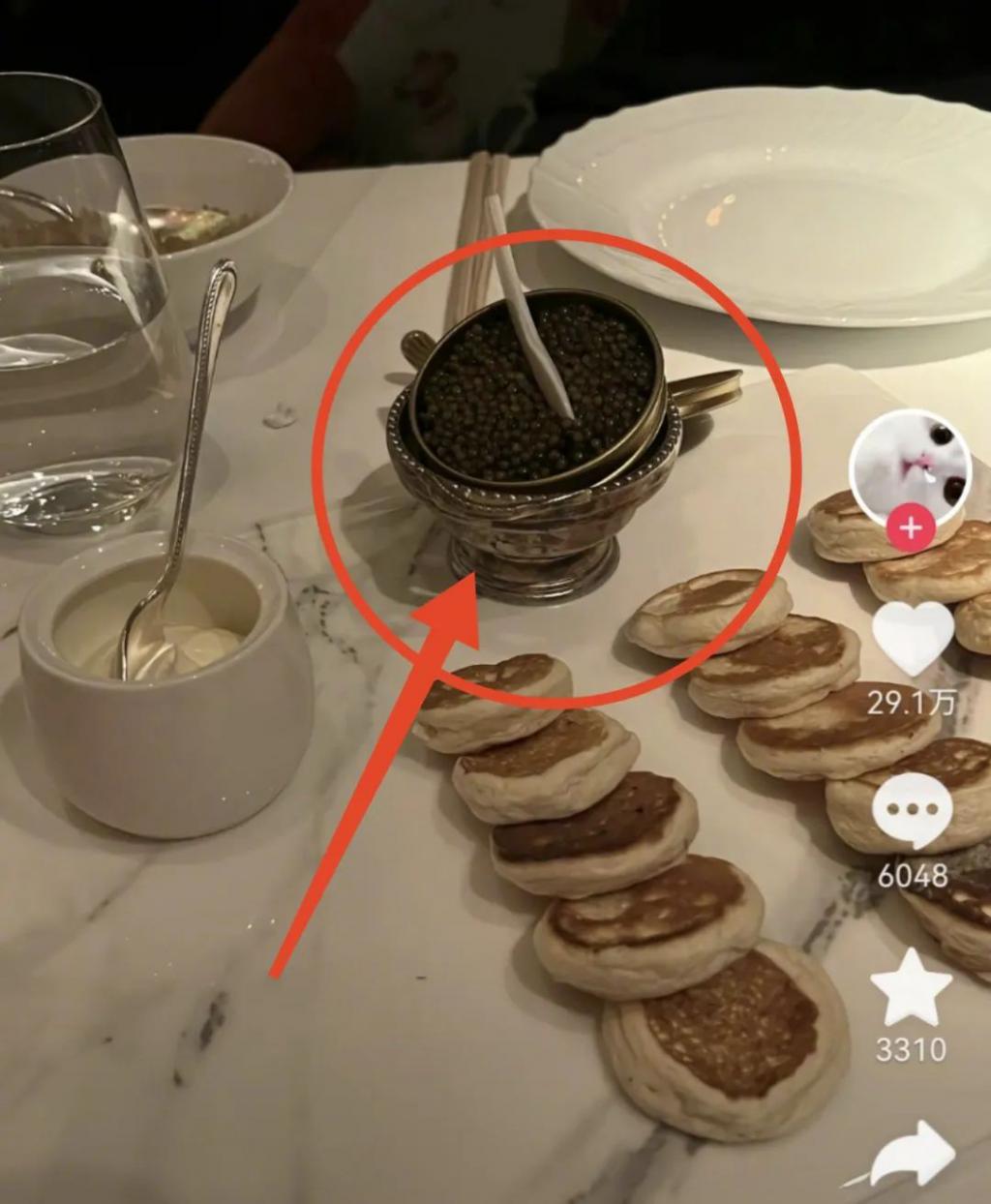 再看桌子上另一个区域,更加奢华,一排白面饼没有夹肉,好像准备了一大碗与黑松露同样价值不菲的黑鱼籽用来夹着吃,估计应该是王诗龄请客吧,因为她的同学八成没有条件这样吃。