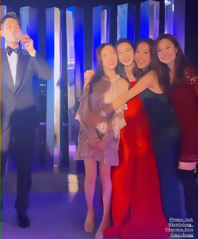 在维港的婚礼晚宴上面,郭嘉文和昔日好友合影,她坐在 C 位出镜。身为同一届港姐前三甲的郭嘉文,和冠军麦诗明同台比美,气质优雅迷人。