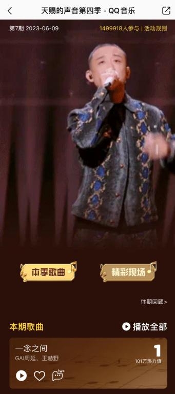 这也是GAI周延在本季《天赐的声音》中第二次获得推荐金曲,从《来自世界的晚安》到《一念之间》两种风格的改编舞台,以及与不同风格的音乐人合作中,GAI周延都能展示出属于自己的优势与特殊之处,无论是在声乐上的极限挑战还是独当一面的作词风格,都得到了音乐合伙人们和现场鉴音团的好评,据网友剧透,下一期与希林娜依·高的合作也得到了全场的好评,让我们来一起期待吧!