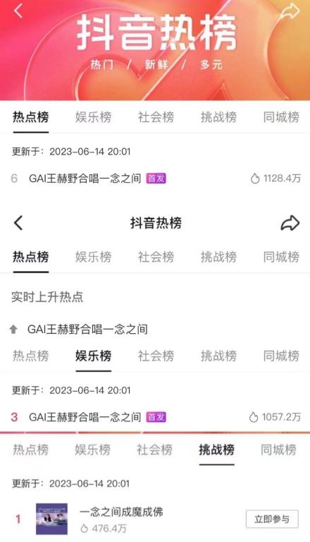 在节目中,胡彦斌称GAI周延与王赫野这首《一念之间》可以称得上为爆单,不得不说,在短视频平台上与音乐平台上《一念之间》的数据都在不断上涨,口碑与二次传播度都大幅提升。在节目播出后,话题词#GAI王赫野合唱一念之间#登抖音热点榜第六位,抖音娱乐榜第三位,#一念之间成佛成魔#的抖音挑战榜直冲榜单第一名。在QQ音乐上《天赐的声音4》第七期歌曲热力值迅速突破一百万,不论在节目中还是在用户平台上都成为第一名,金曲实至名归。