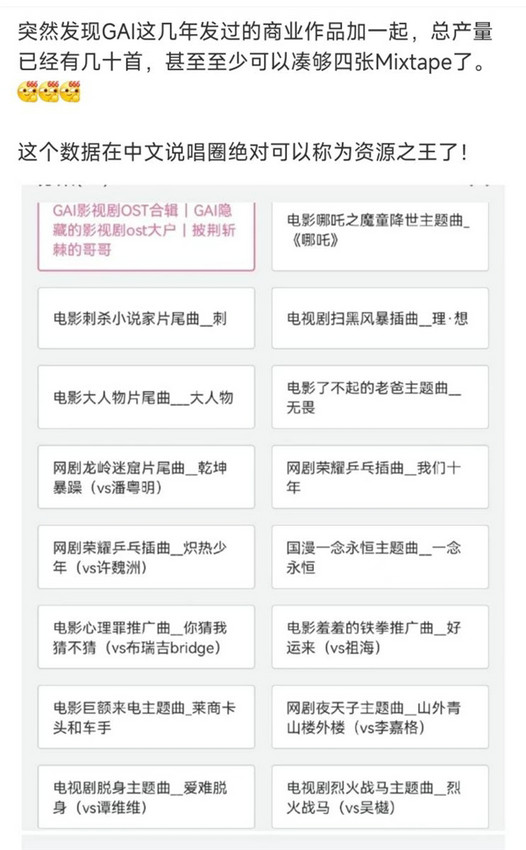 无论是艺术创作能力、歌唱说唱水准还是市场影响力,GAI周延都是毋庸置疑的行业领军者。有网友说“发现GAI这几年的商业作品加一起,总产量已经有几十首,至少可以凑够Mixtape,这个数据在中文说唱圈绝对可以称为资源之王了!”。