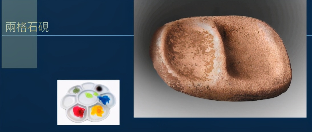 国家博物馆还藏有一方两格石砚,系陕西宝鸡北首岭新石器时代遗址出土。两格都可以用于研磨或调色,左格残留红色颜料。