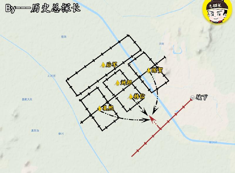 刘邦进抵此地后,意外的发现韩信、彭越大军并没有及时抵达,颇为震怒。
