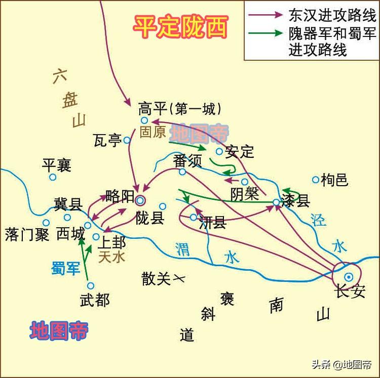 公孙述盘踞蜀地,曾在东汉平陇西时数次出兵支援隗嚣。公元35年,刘秀派大将吴汉、岑彭、来歙、盖延等人兵分两路,水陆并进攻蜀。