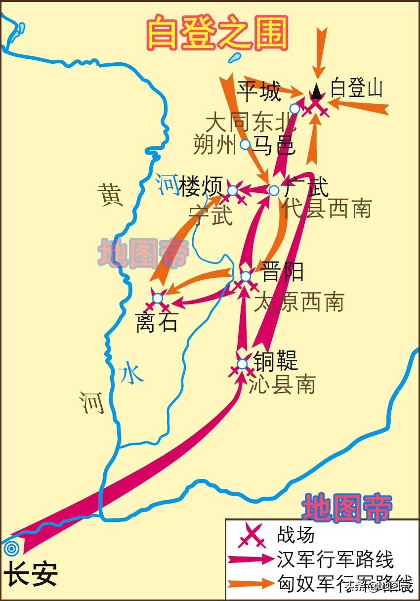 汉高祖刘邦亲率大军迎击匈奴,连战连捷。但刘邦由于轻敌冒进,被匈奴围困大同白登山七天七夜,即白登之围,经谋士陈平运作刘邦才得以脱险。