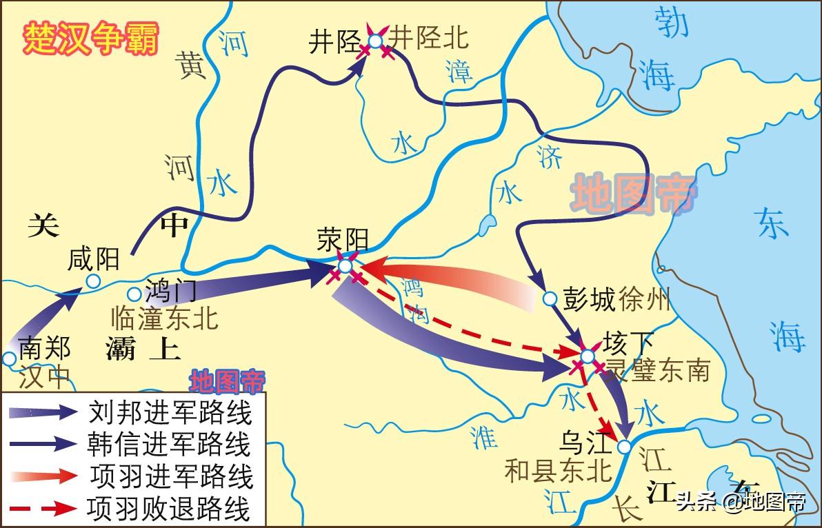 公元前202年,项羽败退垓下,之后走投无路乌江自刎。楚汉争霸以刘邦胜利而告终,西汉建立,都城长安(今陕西西安)。