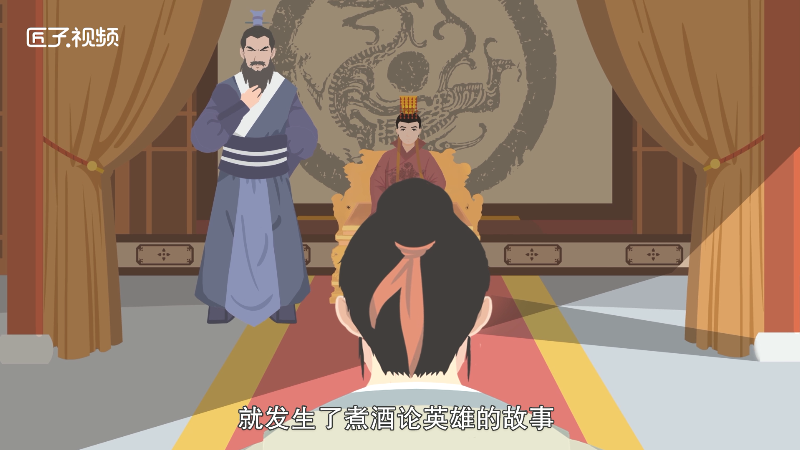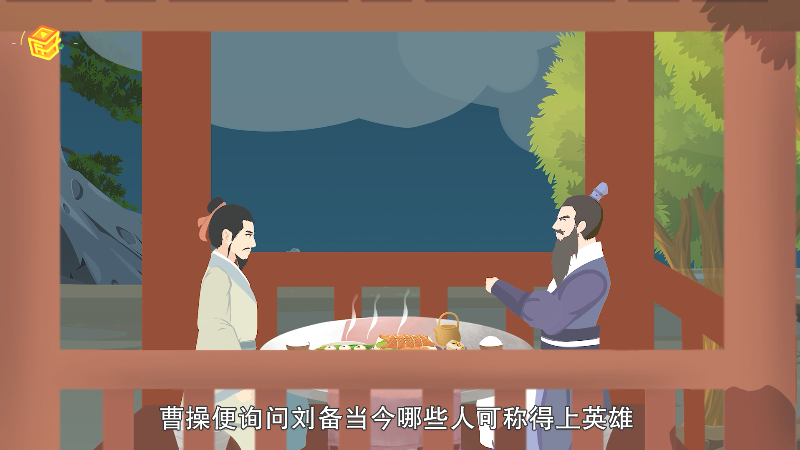 谈论间大风刮起,乌云涌现,曹操便询问刘备当今哪些人可称得上英雄,刘备列举了当时各路英豪。曹操都不以为然,并提出天下英雄只有刘备与自己。刘备听后吓得丢掉了手中的筷子,以为自己的心思被看破。突然,一阵巨雷炸响,刘备借机说被雷吓落了筷子。