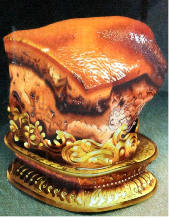 这块东坡肉石高5.73公分,宽6.6公分,是由玛瑙石加工而成。原产自内蒙古阿拉善旗,清代康熙年间,被阿拉善郡王阿宝当作供品献给朝廷。