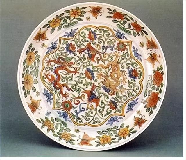 九、五彩龙凤大盘五彩龙凤大盘是明神宗万历时期的作品,高4.6厘米,口径30.3厘米,足径20.3厘米。这个作品的寓意以吉祥如意为主。