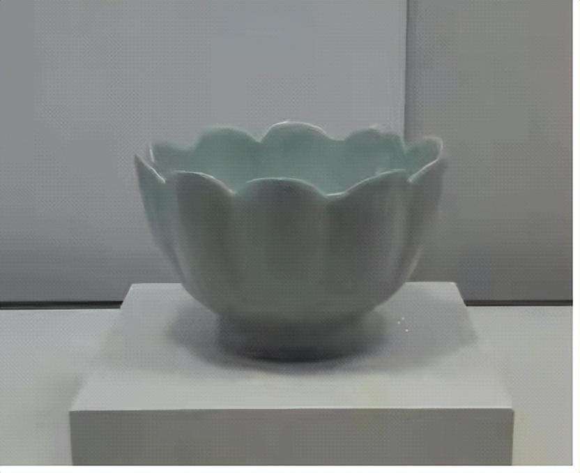 半开的莲花,线条温柔又婉约,汝窑瓷器的青色,高雅而又清丽,仔细端详,青色的釉面上还闪着粉色的光。如此细腻雅致,让人爱不释手。