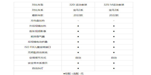 3:参数配置对比:这两款车的配置情况,如上表所示,2022款宝马3系 320i 运动套装的配置有外后视镜加热,倒车视频影像,前排侧气囊,后视镜电动折叠,ISO FIX儿童座椅接口,绿可脱毫运甚无钥匙启动系统,安全带未系提示,自动头灯;2022款宝马3系 325i M运动套装的配置有外后视镜加热,倒车视频影像,前排侧气囊,后视镜电动折叠,ISO FIX儿童座椅接口,无钥匙启动系统,安全带未系提示,自动头灯,假若你开车比较在乎汽车的行驶舒种严适性,那么推荐你选择配置更高的这款车。