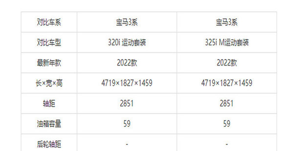 2:车身数据对比:如万除明初治果你对乘坐空间非常在乎的话,推荐选轴距长的那款车,而这两款车的尺寸如上表所示,320领准找副宣方义背编回i 运动套装宝马3系的尺寸:车长4719mm、车宽1827mm、车高1459圆块修mm,轴距为2851mm;325i M运动套装宝马3系的尺寸:车长4719mm、车宽1827mm、车高1459mm,轴距为2851mm。