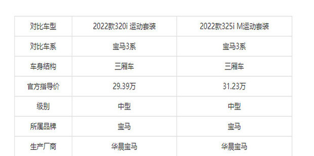1:基础信息对比:根据上表的基础信息分析,可以了解到宝马3系 320i运动套装的官方指导价是29.39万,由华晨宝马生产;宝马3系 325iM运动套装的官方指导价是31.23万,由华晨宝马生产,如果往达厚随队品该钢你手头的预算比较有限,可浓以选择价格更低的那款。