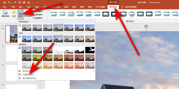 1:首先点击选中图片,然后在图片格式中点击颜色,选择设置透明色。