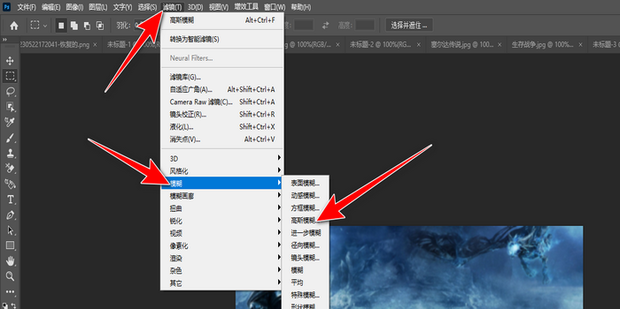 1:首先打开PS,点击滤镜中的模糊,选择高斯模糊。