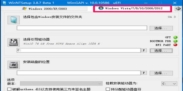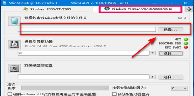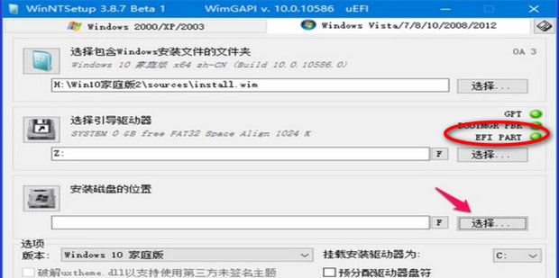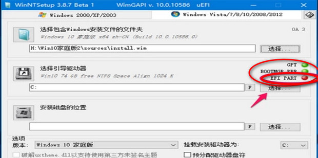 4:GPT、BOOTMGB PBR和EFI PART后的指示灯都为绿色,点击安装磁盘静位置,选择一个安装系统的磁盘位置,选择完后点击安装即可