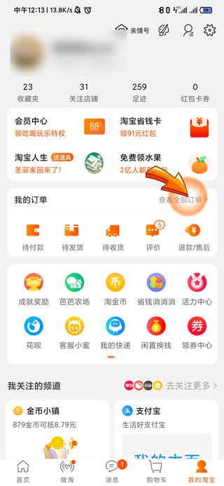 2、然后在我的淘宝页面中部有“我的订单”选项,点击该选项右侧的“查看全部订单”。