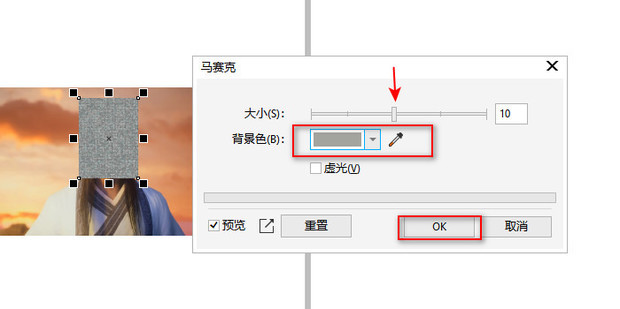4:确定马赛克的大小和背景色,点击ok即可完成添加。