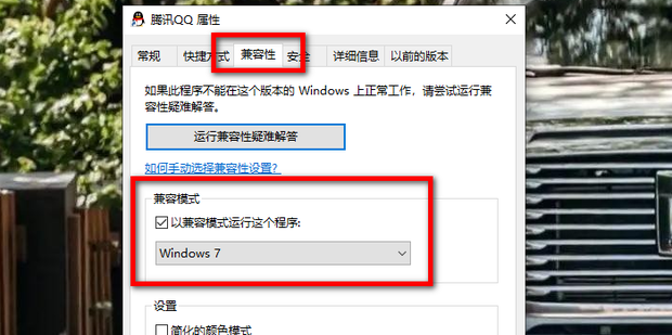 2:在兼容性来自设置中勾选以兼容模式运行这个程序,然后选择为兼容Windows7。