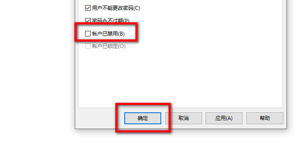 3:最后将账户已禁用选项前的勾取消掉,点击确定即可。