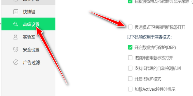 4:最后点击高级设置,勾选极速模式下弹窗用新标签打开即可。