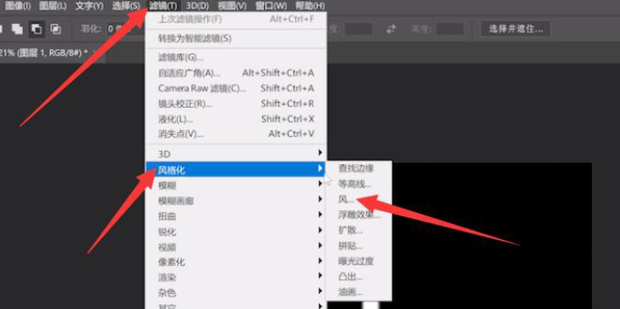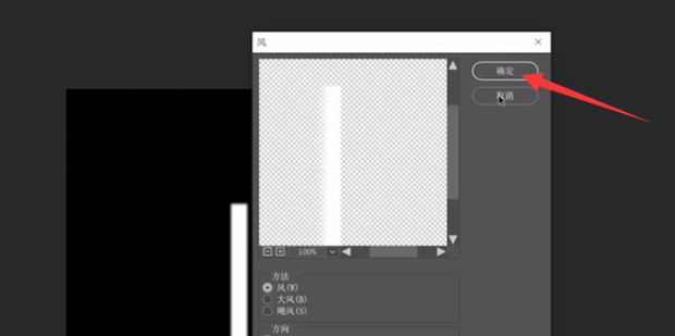 7:在滤镜中找到风格化,添加风的效果,方法为风,方向选择从右,此效果可多添加两次,让效果更加明显