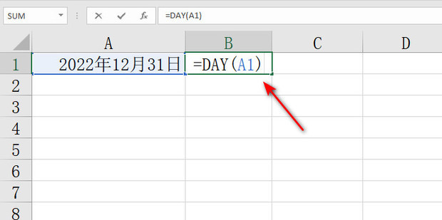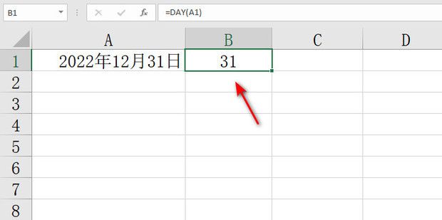 4:此时在B1单元格内输入=DAY(A1),然后点击回车即可获取当前月份的天数了。