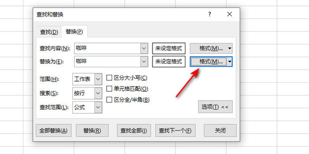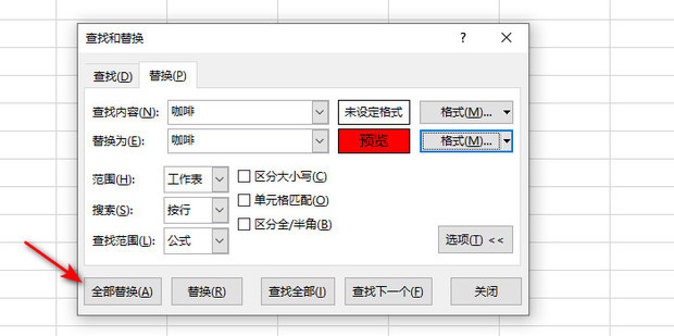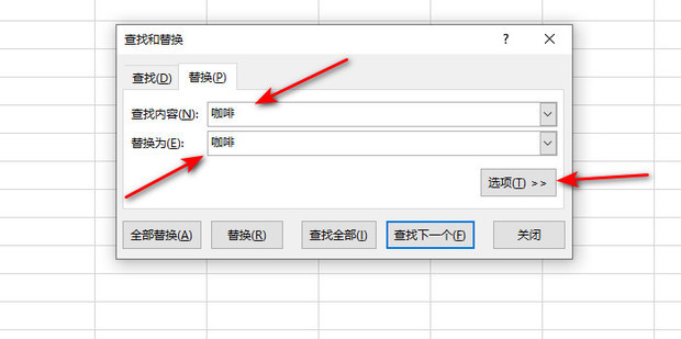 4:查找内容框内输入咖啡,替换为内容框内输入咖啡,然后点击选项。