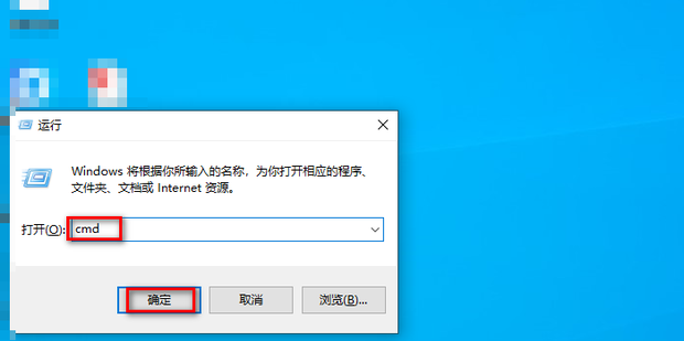 2:在弹出的运行窗口中输入cmd,输入完成后点击确定。