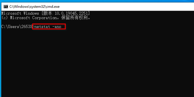3:打开后输入命令:netstat -ano,该命令可以查看所有的端口,输入完成后点击回车键。