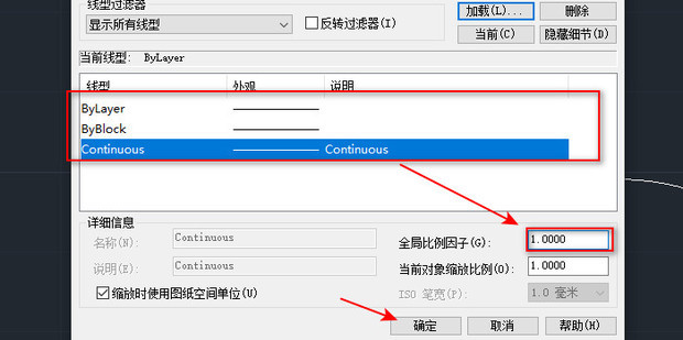 3:选择需要设置的线型,在右下角即可修改全局比例,点击确定完成修改边皮争百八袁种矿甚。