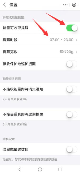 进入页面,将能量可收取提醒按钮开启,设置提醒时段即可。