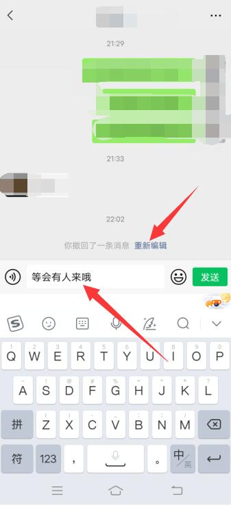 点击重新编辑字样,在输入框中可以看到刚刚撤回的内容,可以重新编辑发送。