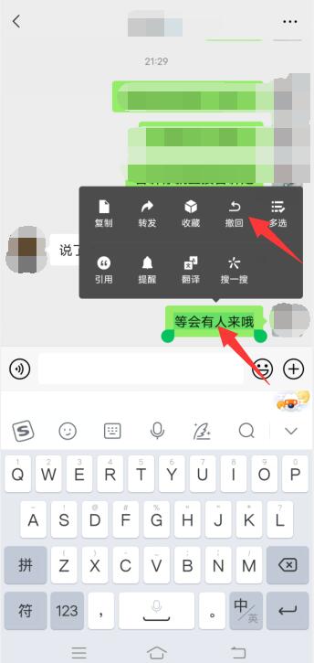 打开微信,进入好友聊天界面,长按发送消息内容,选择撤回。
