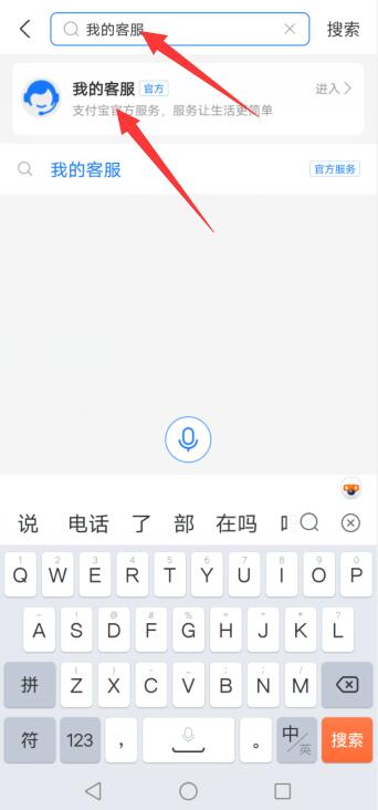 打开支付宝APP,在搜索框输入我的客服并点击。