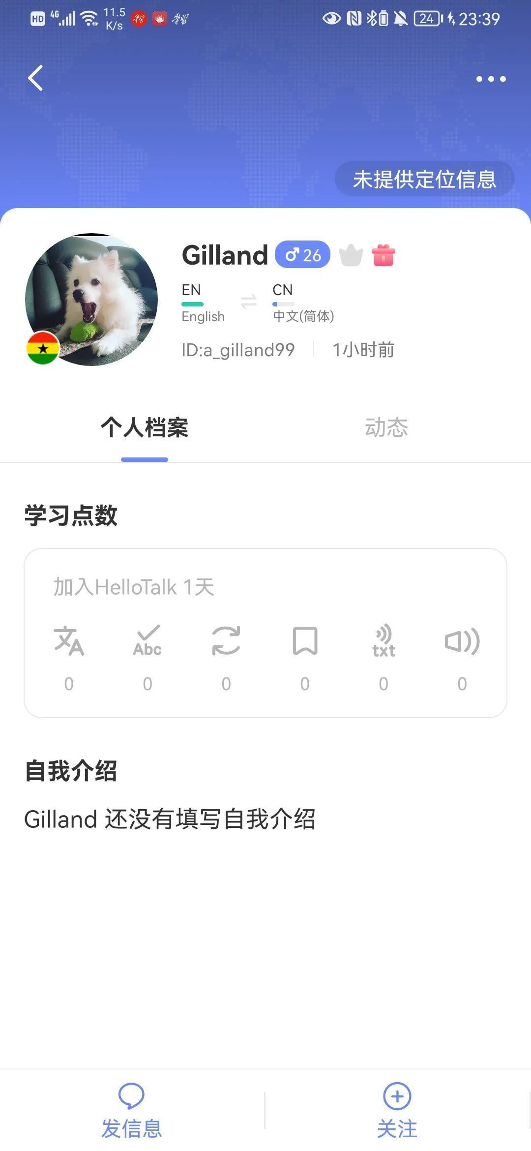 想借住Hello Talk这个APP提高英语学习能力,发现一个热情的美国老哥,注册国别是加纳,岁数26,聊天时自称49岁,美国人。