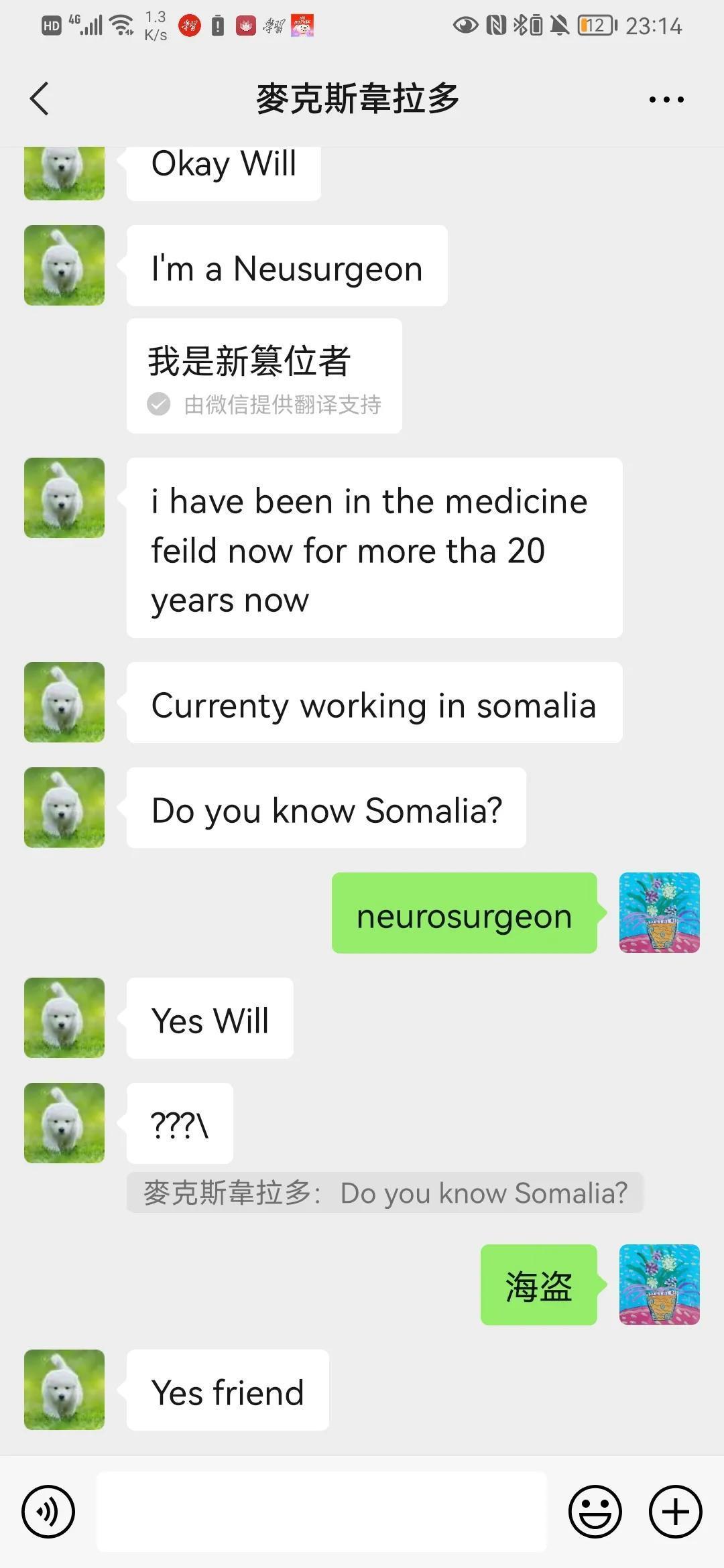 然后基本自说自话,说自己是神经外科医生(高端!),但是医生都是博士学位,出于严谨的习惯,不该有那么多语法和拼写错误。然后说自己在索马里工作,我此时已经非常警惕了。